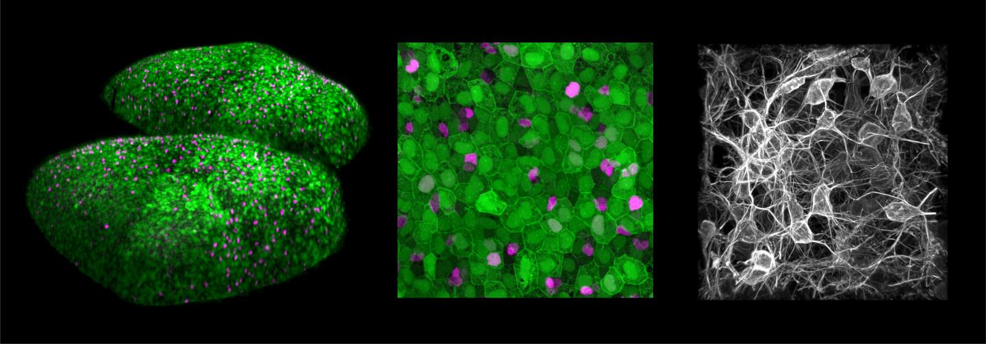 Center: Magnification enabling identification of stem cells that are quiescent (green only), activated (green and magenta), and in the process of differentiation (magenta only).