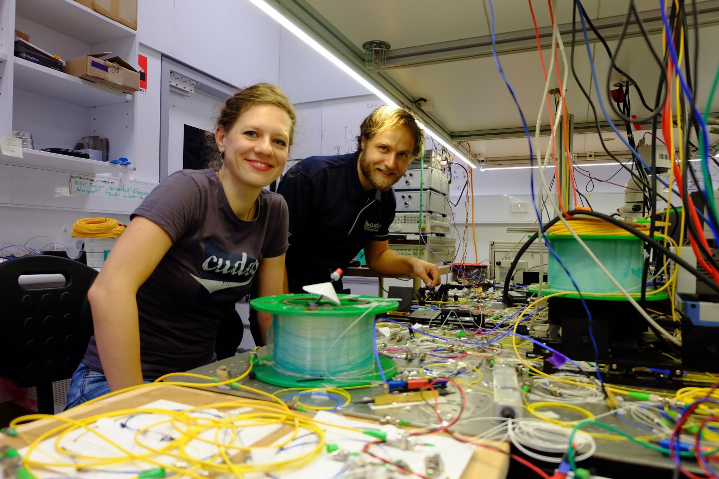 image: Dr Birgit Stiller (l) and Dr Moritz Merklein (r) in the optical labs at the University of Sydney Nanoscience Hub.