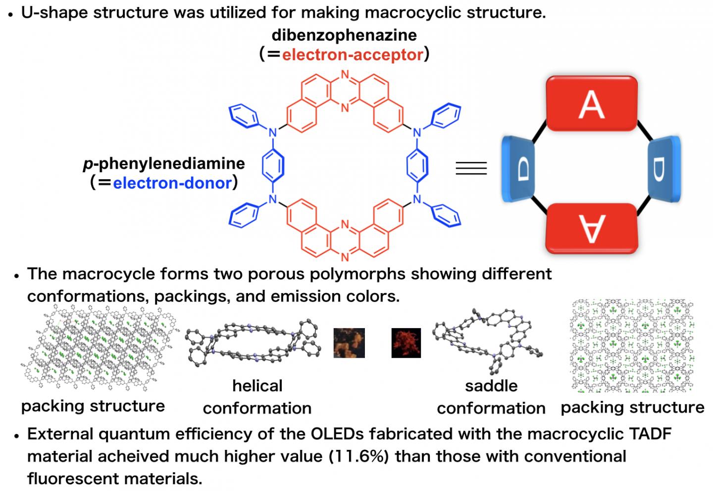 Now, a research team led by Professor Youhei Takeda at Osaka University has designed and synthesized an efficient macrocyclic OLED emitter in which donor and acceptor regions alternate in a permanently bonded ring structure. They found that OLED devices fabricated with the new macrocyclic emitter show much better efficiencies compared with linear molecular emitters (which act like open forms of the macrocycles), due to the fact that the macrocycles can more efficiently harvest ambient heat energy in a process called "thermally activated delayed fluorescence."
