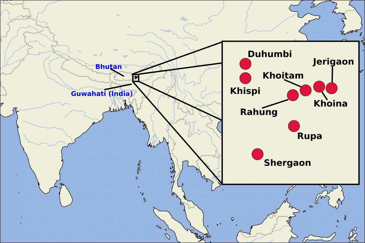 image: Map showing geographic locations for speakers of eight Western Kho-Bwa languages