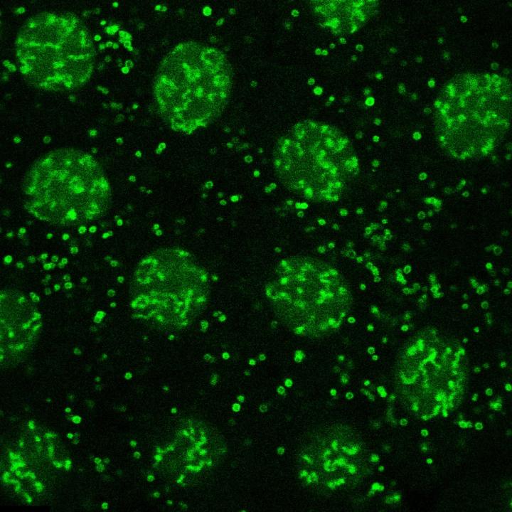 image: The researchers used advanced fluorescence microscopy to view lipid droplets in fruit fly embryos. Here, H2Av (fluoresced in green) is present in the cell's nuclei (the large blobs) and on lipid droplets (the smaller rings). The lipid droplets regulate how fast H2Av enters a cell's nucleus by storing the H2Av until the nucleus needs it.
