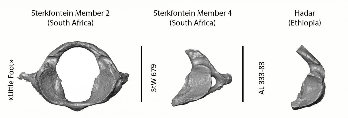 image: Comparison of the nearly intact first cervical vertebra of 'Little Foot' and two other Australopithecus from Sterkfontein in South Africa and from Hadar in Ethiopia showing how complete 'Little Foot' is as compared to the rest of the fossil record.