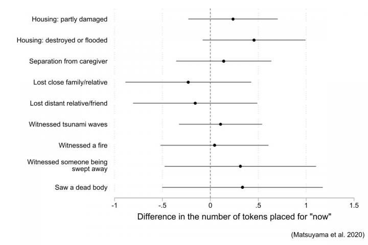 Among the various forms of trauma, which included losing a caregiver, witnessing the tsunami waves or fires, or seeing a dead body, the children whose had lost their housing had higher delay discounting. In other words, they assigned more tokens to "now," showing preference for smaller reward in the short term.
