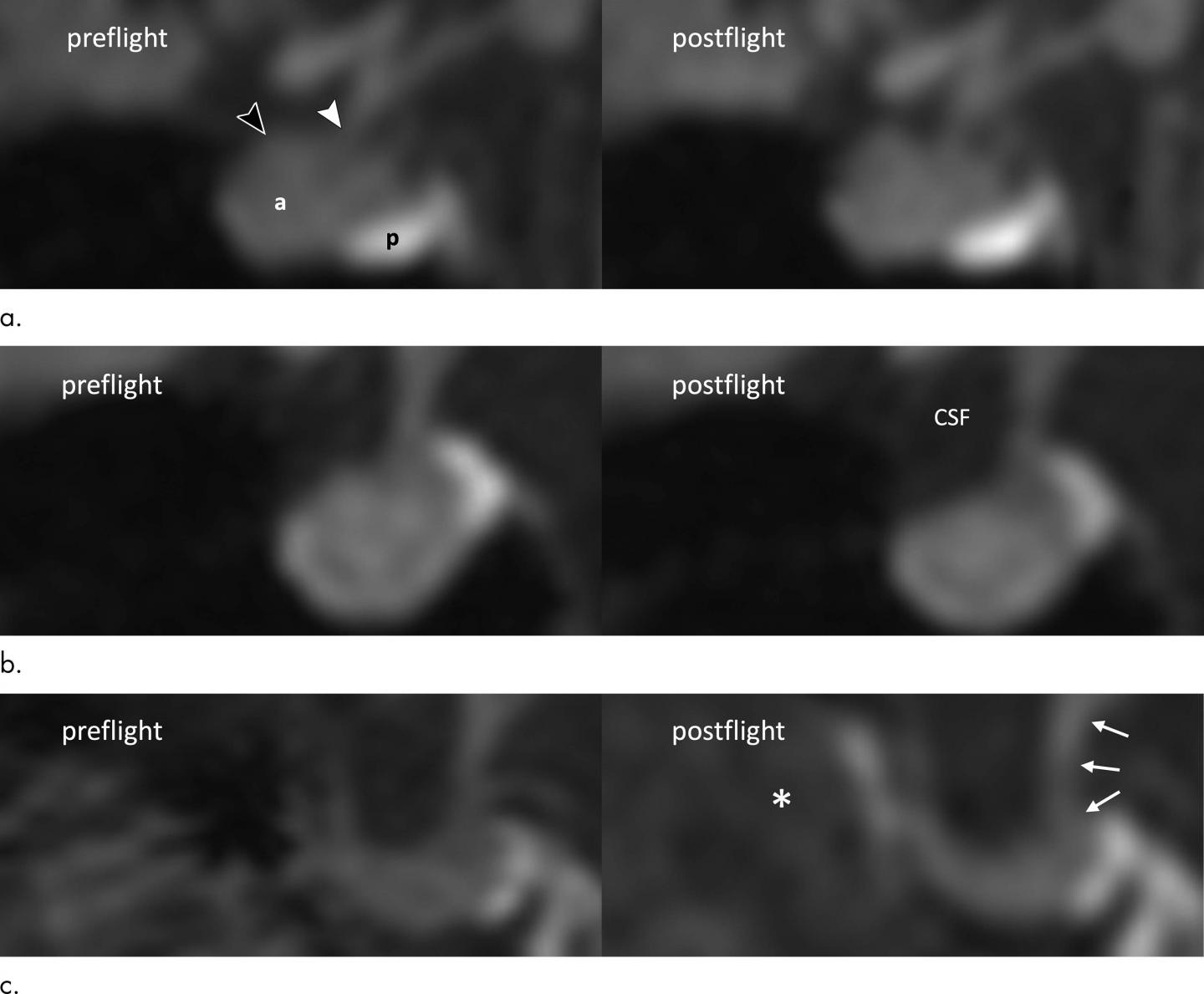 image: Pituitary deformity examples in three crewmembers before spaceflight and after spaceflight (day 1). (a) Only the first crewmember shown in a had no previous exposure to spaceflight. Reconstructed orthogonal sagittal three-dimensional T1-weighted images in the pituitary gland centered at the pituitary stalk are shown for each crewmember. (a) Before flight there is normal upward convexity of the pituitary gland dome (black arrowhead) and a straight pituitary stalk (white arrowhead). In this astronaut, there is no change in the morphologic structure of the pituitary gland or stalk after spaceflight (pituitary deformity score, 0). The anterior pituitary gland (indicated by the a in a) and posterior pituitary gland (p) are indicated. (b) Before spaceflight there is normal upward convexity of the pituitary gland dome. After spaceflight there is flattening of the pituitary gland dome (pituitary deformity score, 1). Note the cerebrospinal fluid (CSF) within the suprasellar cistern immediately above the dome of the pituitary gland. (c) Before spaceflight there is mild concavity of the pituitary gland dome. After spaceflight there is moderate concavity of the pituitary gland dome with loss of volume and new subtle posterior deviation with slight curvature of the pituitary stalk (arrows; pituitary deformity score, 1). *Increased congestion of the sphenoid sinus after spaceflight is shown.