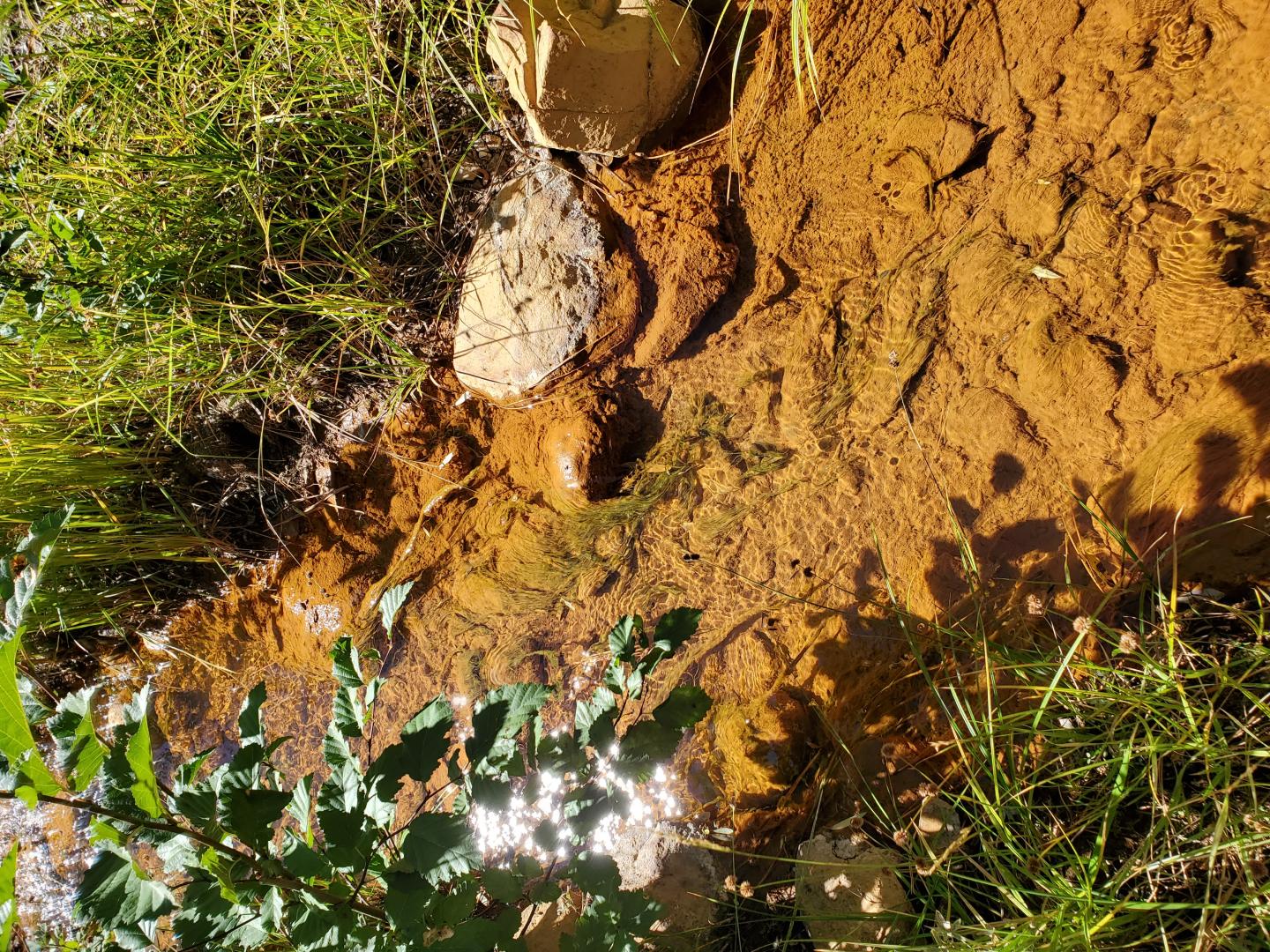 image: Leviathan Creek below an abandoned open pit mine, an EPA Superfund site in the Sierra Nevada, where iron oxide deposits coat the stream bottom.
