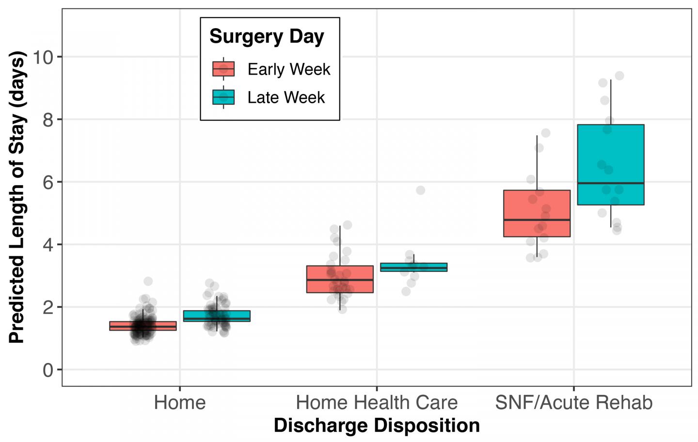 image: Box-and-whisker plot depicting predicted lengths of hospital stay with respect to discharge disposition of patients surgically treated early or late in the week. Acute Rehab = acute rehabilitation center; Early Week = Monday + Tuesday + Wednesday; Late Week = Thursday + Friday; SNF = skilled nursing facility.