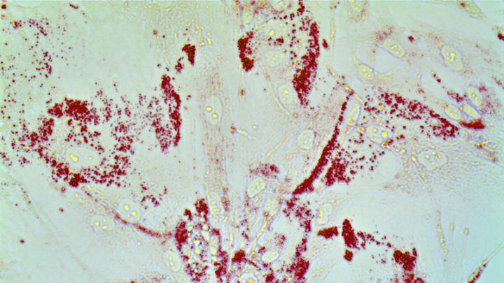 image: Cancer cells gobble up lipids. Prostate cells are stained with Oil-Red O to detect lipid droplets. Our work shows that redistribution of lipids from prostate cancer microenvironment triggers inflammation and drives prostate cancer metastasis.