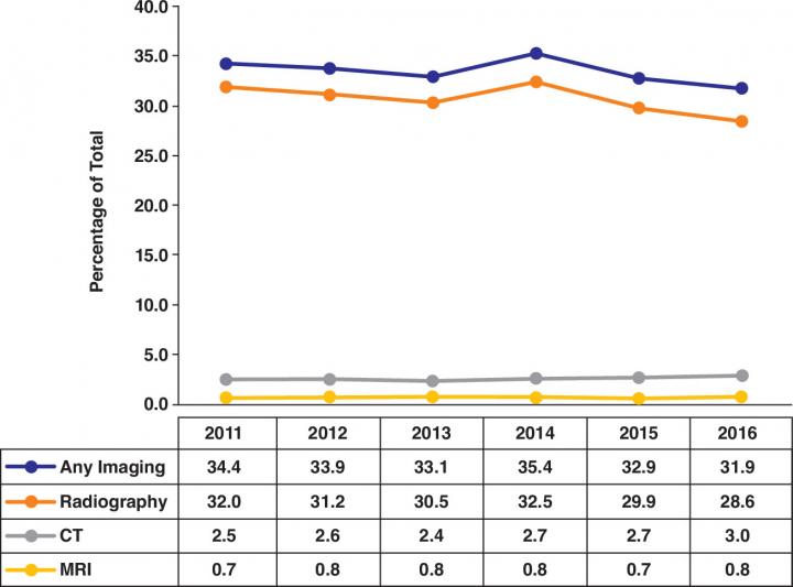 Excluding patients with concomitant encounter diagnoses suggesting trauma, as well as those with previous visits for back pain, Current Procedural Terminology codes were used to identify three imaging modalities: radiography, CT, and MRI.