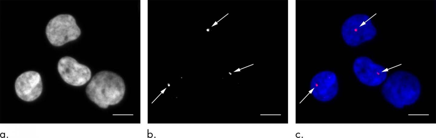 image: Immunofluorescent staining performed to depict γ-H2AX foci. Representative images of γ-H2AX foci in peripheral blood lymphocytes in an 82-year-old woman who underwent standard-dose CT. (a) Nuclear DNA of four lymphocytes. (b) γ-H2AX foci (arrows). (c) Markers of DNA double-strand breaks. In this merged image, DNA is blue and γ-H2AX foci are red (arrows show small foci). γ-H2AX, a marker of DNA double-strand breaks, is a phosphorylated type of histone H2AX. Scale bar: 5 mm.
