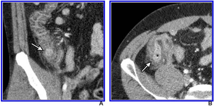 image: IV contrast-enhanced 2-mSv 4-mm-thick transverse and coronal (b) CT images show inflamed diverticula (arrows), segmental colonic wall thickening, and adjacent pericolic fat stranding.