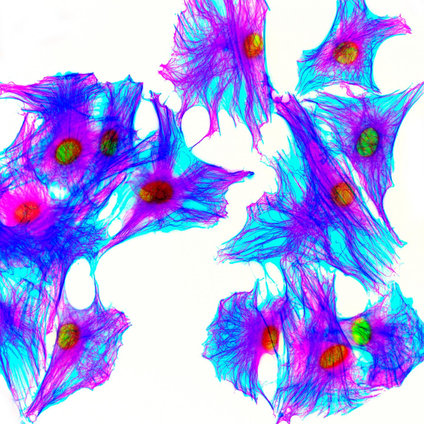 image: This image shows HeLa cells. HeLa cells are an immortal human cancer cell line derived from a cancerous tumor of Henrietta Lacks. These cells have unique properties that allow them to continually grow outside the body and have been used to derive many cell lines for cell culture experiments. This image has been produced by fluorescently staining the cells with Alexafluor 488 to detect alpha tubulin, TRITC phalloidin marks actin in the cells cytoskeleton and DAPI marks the cell nucleus. The image has been inverted and adjusted using imaging software.