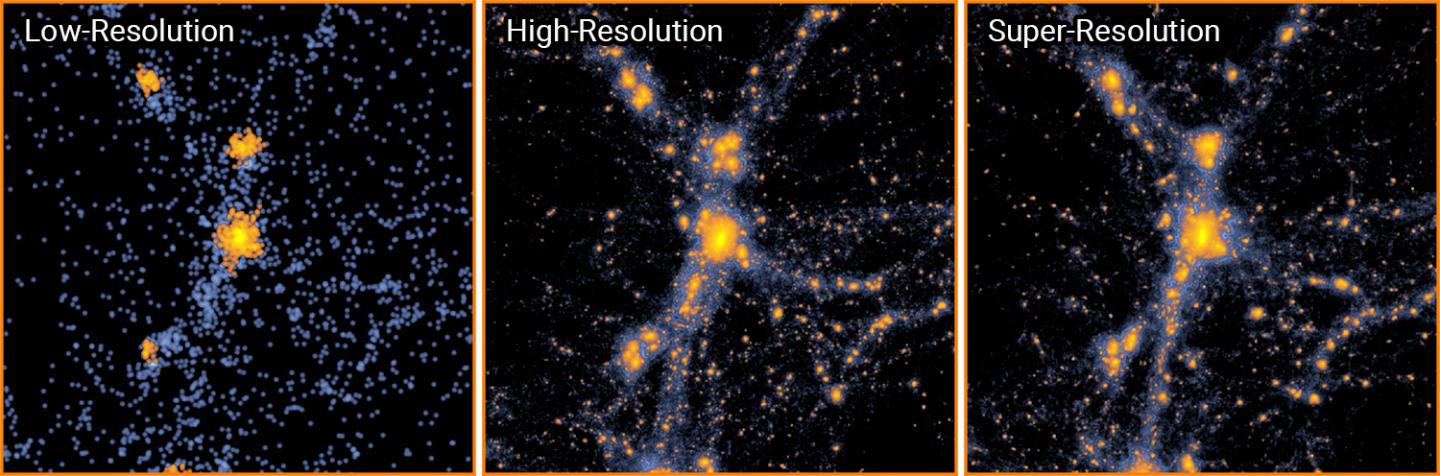 The trained code can take full-scale, low-resolution models and generate super-resolution simulations that contain up to 512 times as many particles. For a region in the universe roughly 500 million light-years across containing 134 million particles, existing methods would require 560 hours to churn out a high-resolution simulation using a single processing core. With the new approach, the researchers need only 36 minutes.