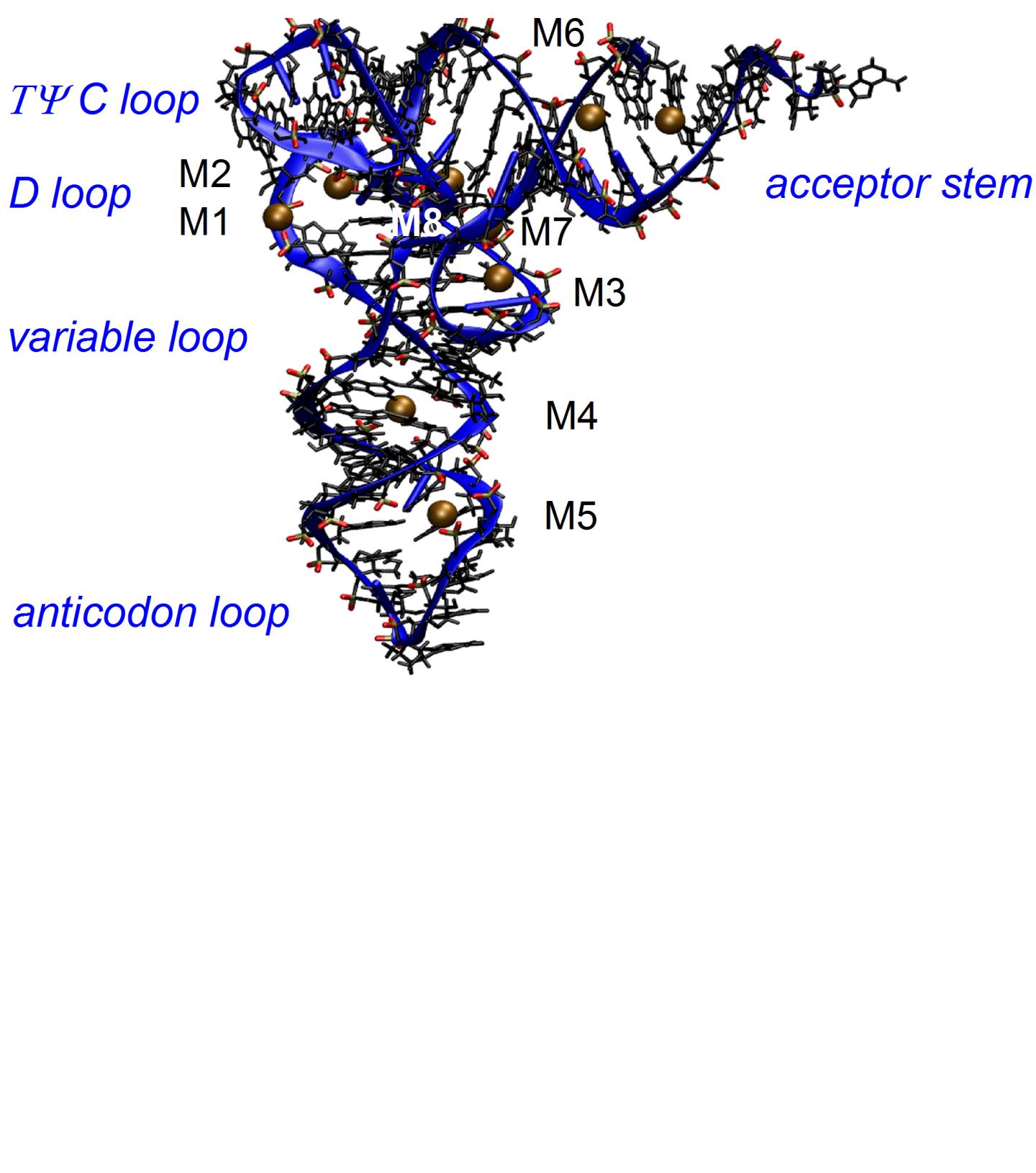 image:Â The folded structure consists of a sequence of loop and stem regions. The phosphate-sugar backbone is shown as a blue ribbon to which the nucleobases, shown as molecular structures, are attached. The anticodon loop serves for reading the information which is provided by a messenger RNA and used for synthesizing proteins at the acceptor stem. Contact ion pairs are formed preferentially at the sites M1 to M8.