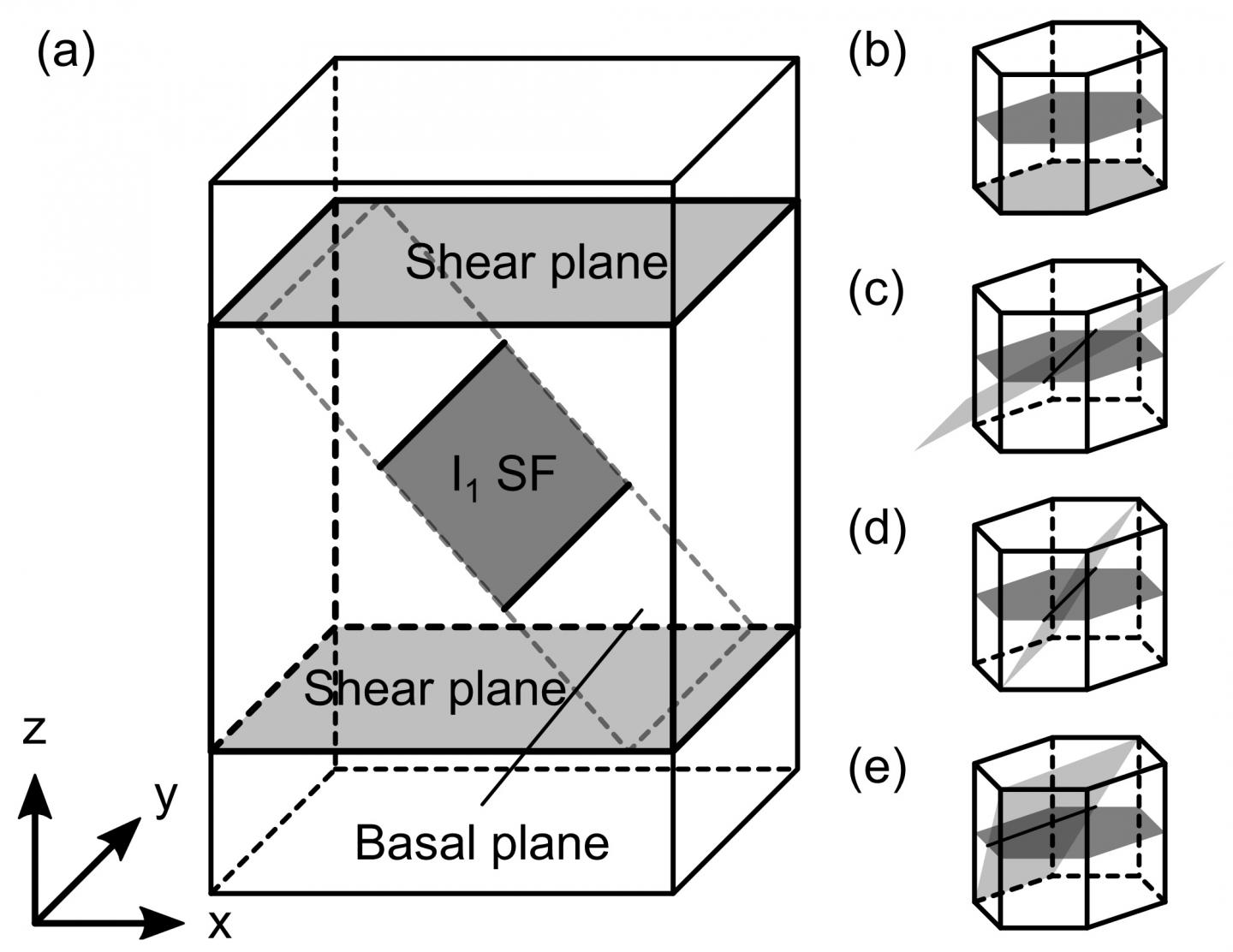 Stacking fault is one kind of defect in crystals. Previous first-principles calculations found that the alloying elements capable of improving ductility reduce the stacking fault energy. Yoshikawa and Matsunaka applied shear stress to atomic models of about 60,000 atoms including an I1-type stacking fault and observed its deformation behavior. Analyzing atomic configurations at each snapshot in the simulations, they discussed defect nucleation from the I1-type stacking fault. Then, they found that dislocations associated with pyramidal slips as well as (11-21) twins were generated from the I1-type stacking fault, depending on the applied stress state.