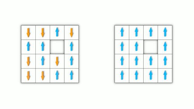 video: The child's puzzle can be used to explain Nagaoka ferromagnetism. The puzzle on the left shows that every shuffle changes the spin configuration. The puzzle on the right shows all the spins aligned, which lowers the energy of the system.