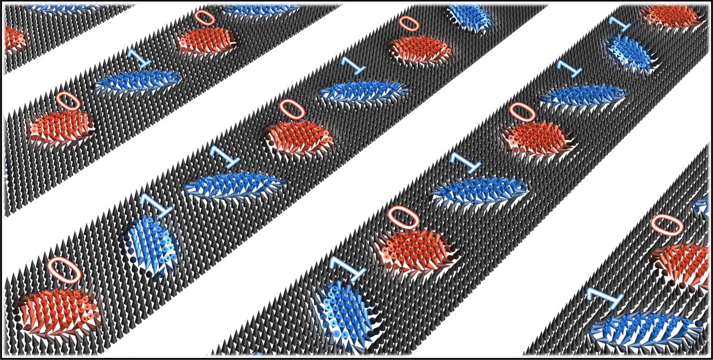 image: Schematic representation of the magnetization in an advanced racetrack memory data storage. Skyrmions (blue) and antiskyrmions (red) constitute the '1' and '0' bits, respectively.