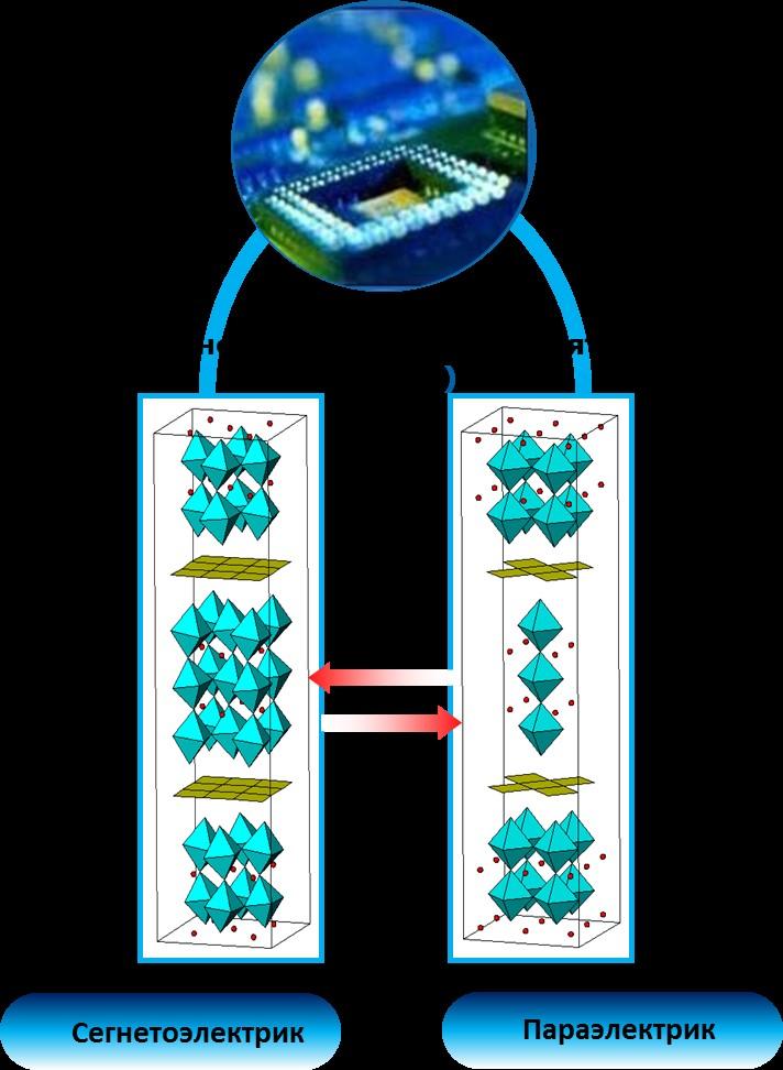 The main element of the microchip is a thin film of ferroelectric. Ferroelectrics are substances that have spontaneous electric polarization in the absence of an external electric field in a certain temperature range. The scientific and practical interest in Aurivillius phases is based on the transition from the ferroelectric state to the paraelectric phase, which is accompanied by the disappearance of spontaneous polarization. The principle of operation of FRAM chips is based on polarization switching by an external electric field between the two phases: polar and nonpolar, while the memory cell stores 0 and 1, respectively. The information is recorded or read by switching the polarization of ferroelectric domains by an external electric field.