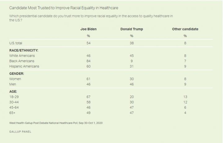 "Joe Biden has a clear advantage as the candidate Americans prefer to lead healthcare and create a more racially equitable healthcare system in the United States during this global pandemic," said Dan Witters, Gallup senior researcher. "While some groups were more split, U.S. adults are generally aligned in Biden's favor by wide margins. It will be interesting to see how this plays out at the ballot box in November."