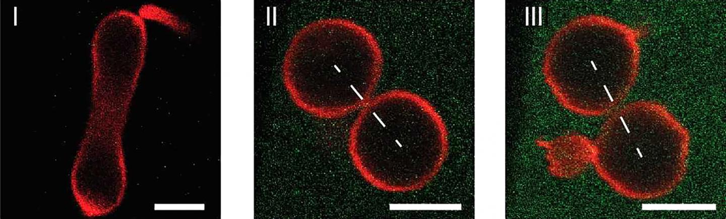 image: Division process of an artificial cell (red), which is controlled by the protein concentration (green) in the outer aqueous solution: (I) Low protein concentrations induce a prolate or dumbbell shape of the cell with a wide membrane neck. A further increase in the protein concentration leads to a closed membrane neck in (II) and to a curvature-induced constriction force that cleaves this neck in (III), thereby creating two separate daughter cells.