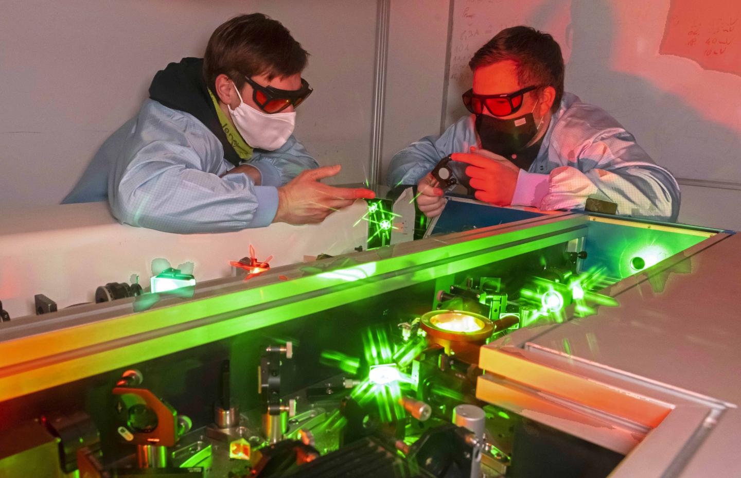 image: First author of the current study Tobias Helk (l.) and Dr Frederik Tuitje in a laser laboratory at the University of Jena.