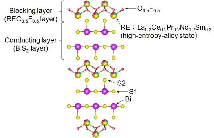 One strategy is the use of layered materials with a molecular structure consisting of alternating superconducting layers and "blocking layers" acting as insulating spacers. A team led by Associate Professor Yoshikazu Mizuguchi from the Department of Physics, Tokyo Metropolitan University, has uncovered an important aspect of designing the insulating layer. They were able to combine five different rare earth (RE) elements, lanthanum, cerium, praseodymium, neodymium, and samarium, and create a "high entropy alloy" in the blocking layer. High entropy alloys have attracted considerable attention in recent years for their toughness, resistance to fatigue and ductility, amongst many other notable physical properties.