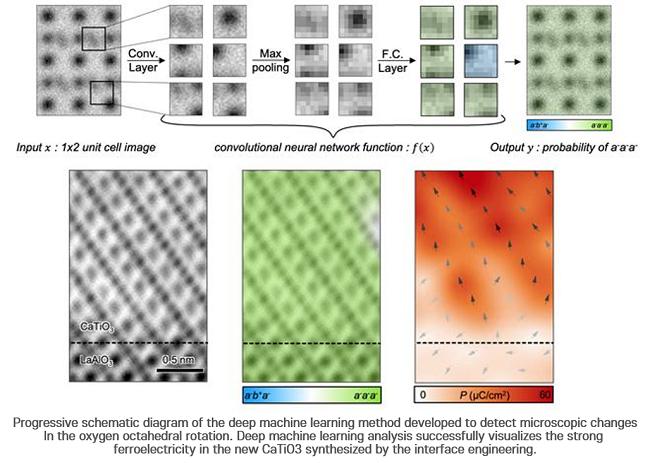 image: Progressive schematic diagram of the deep machine learning method developed to detect microscopic changes in the oxygen octahedral rotation. Deep machine learning analysis successfully visualizes the strong ferroelectricity in the new CaTiO3 synthesized by the interface engineering.