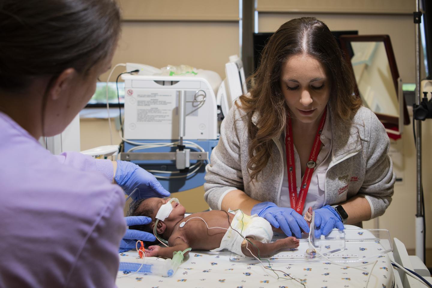 image: Tory Peitz, R.N., (left) and Victoria Catalano, RDN, LD, CNSC, CLC, (right) Pediatric Dietitian Specialist in the Neonatal Intensive Care Unit at Children's National Health System, measure the length of a micro preemie who weighed 1.5 pounds at birth.