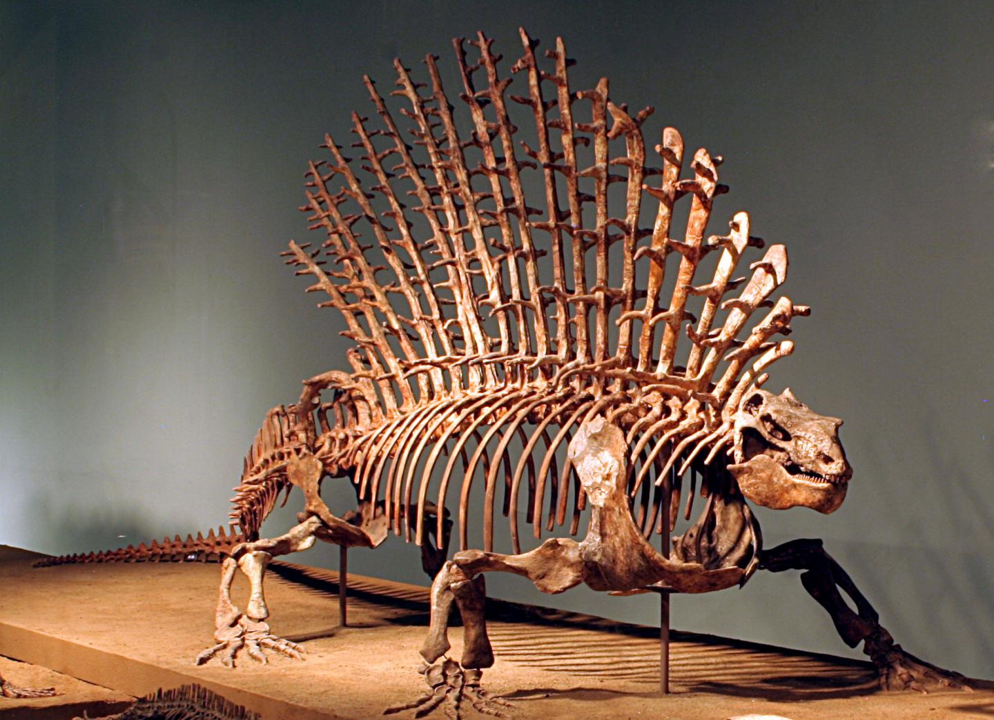 image: Photograph of a skeleton of the early non-mammalian synapsid (ancient mammal relative) Edaphosaurus on display at the Field Museum of Natural History.