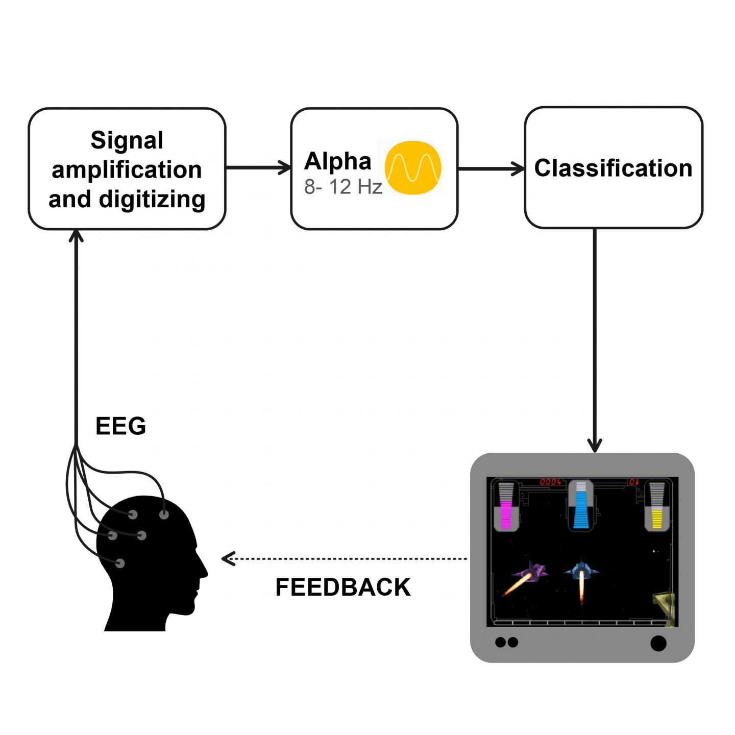 image: Neurofeedback loop: The EEG is recorded and the participant receives an instant feedback from his/her attention level captured by the alpha rhythm through a computer game, allowing to train the brain to concentrate.