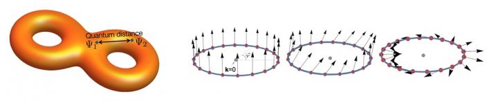 image: (Left) A cartoon representing the geometric structure of the Bloch states. The quantum distance measures the quantum mechanical distance between two Bloch wave functions. (Right) Bloch wave functions of the flat band can be represented by the pseudo-spin (arrows). The relative angle between two pseudo-spins corresponds to the quantum distance between the relevant Bloch states.
