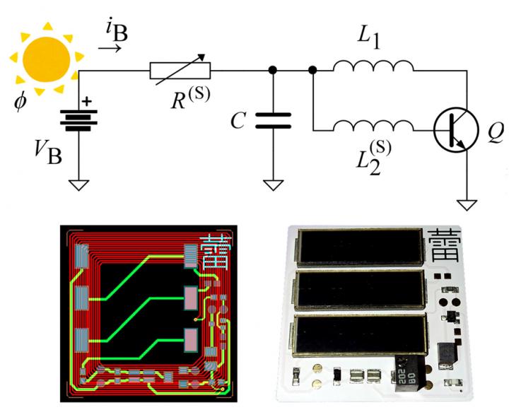 The key to realizing the proposed circuit was to start from one of the smallest chaotic oscillators known, involving just a single bipolar transistor, two inductors, one capacitor, and one resistor. This circuit, introduced four years ago by Dr. Ludovico Minati, the lead author of the study, and co-workers, was remarkable for its rich behaviors that contrasted with its simplicity [3]. Such a circuit was modified so that its power source would be a compact solar panel rather than a battery, and so that one of its inductors could enable coupling via its magnetic field, effectively acting as an antenna. The resulting prototype device was found to be able to reliably produce chaotic waves depending on the level of light. Moreover, bringing multiple devices closer would cause them to generate consonant activity in a manner representative of the average light level. "Effectively, we could do spatial averaging over-the-air just with a handful of transistors. That's incredibly fewer compared to the tens of thousands that would be required to implement a digital processor at each node," explain together Dr. Hiroyuki Ito, head of the laboratory where the device prototype was built, and Dr. Korkut Tokgoz from the same laboratory. The circuit design and results are carefully detailed in the article that has recently appeared on the IEEE Access journal [1].