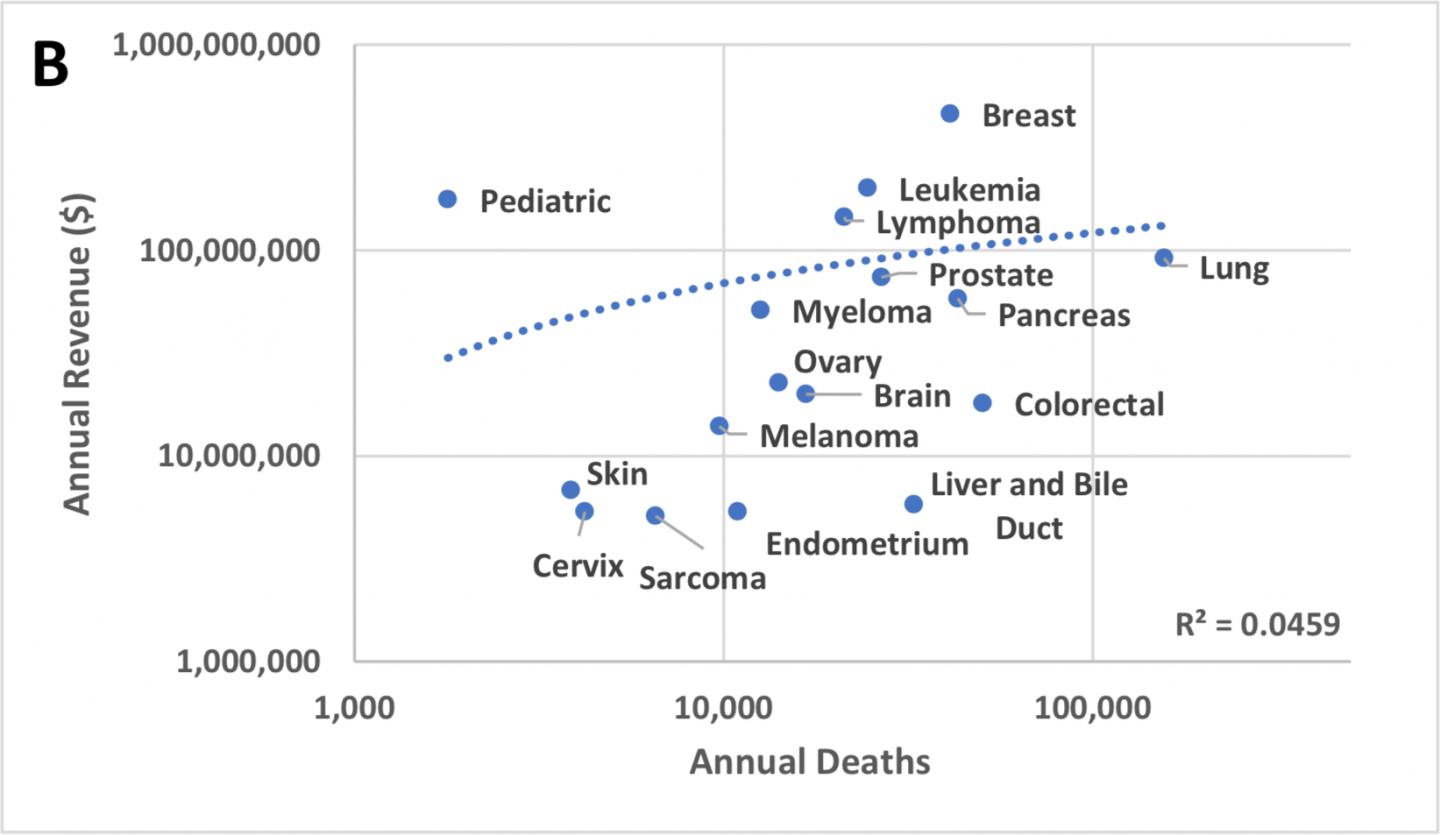 The authors compared the amount of revenue for each cancer type with the number of new cases, number of deaths and number of years of life lost to see if the amount of funding for each cancer is proportional to how common and/or deadly it is.