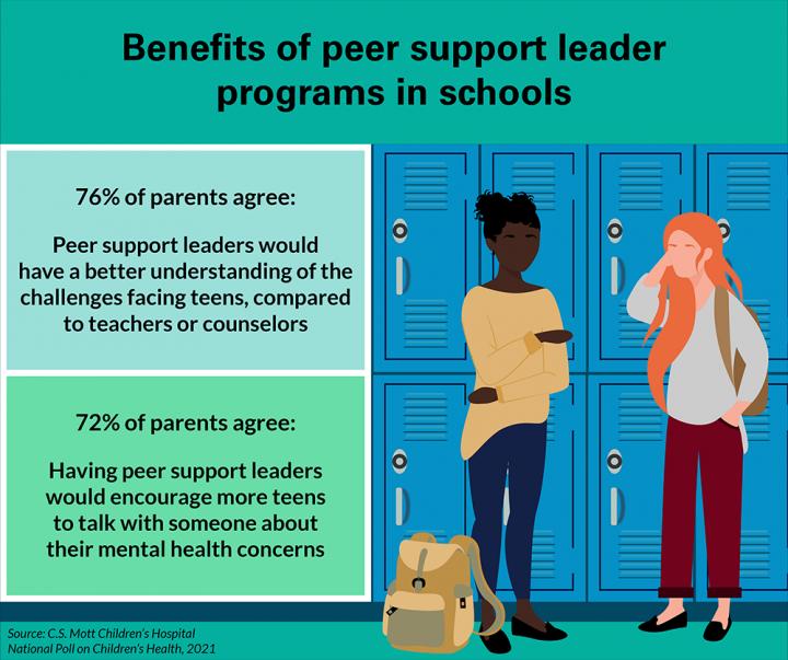 And three-quarters of parents in a new national poll think peers better understand teen challenges, compared to teachers or counselors in the school. The majority also agree that peer support leaders at school would encourage more teens to talk with someone about their mental health problems, according to the C.S. Mott Children's Hospital National Poll on Children's Health at Michigan Medicine.