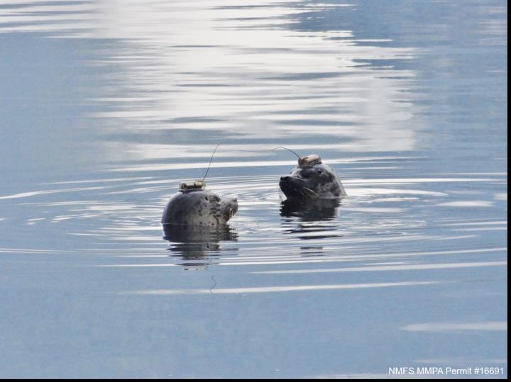 image: Harbor seals with tags (NMFS MMPA permit 16691).