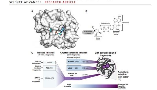 image: Fig. 1. Overview of the fragment discovery approach for SARS-CoV-2 Nsp3 Mac1 presented in this study. (A) Surface representation of Nsp3 Mac1 with ADPr bound (cyan) in a deep and open binding cleft. (B) Nsp3 Mac1 has (ADP-ribosyl)hydrolase activity, which removes ADP-ribosylation modifications attached to host and pathogen targets. ADPr is conjugated through C1 of the distal ribose. (C) Summary of the fragment discovery campaign presented in this work. Three fragment libraries were screened by crystallography: two general-purpose [XChem and University of California San Francisco (UCSF)] and a third bespoke library of 60 compounds, curated for Mac1 by molecular docking of more than 20 million fragments. Crystallographic studies identified 214 unique fragments binding to Mac1, while the molecular docking effort yielded in 20 crystallographically confirmed hits. Several crystallographic and docking fragments were validated by isothermal titration calorimetry (ITC), differen tial scanning fluorimetry (DSF), and a HTRF-based ADPr-peptide displac