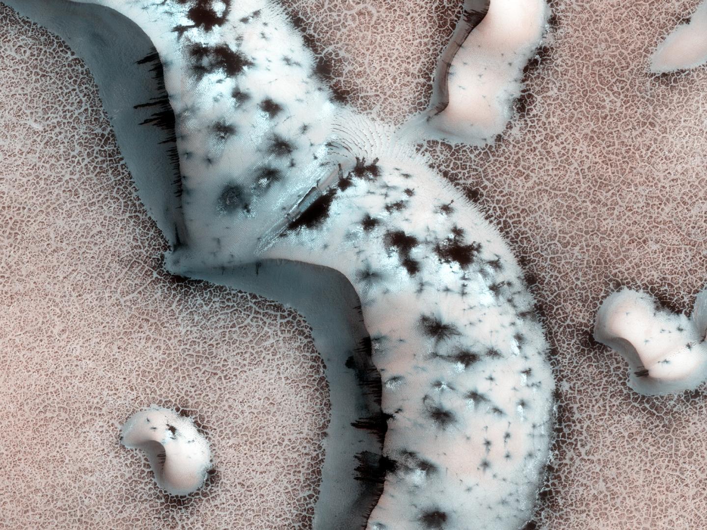 image: Polar ice caps on Mars are a combination of water ice and frozen CO2. Like its gaseous form, frozen CO2 allows sunlight to penetrate while trapping heat. In the summer, this solid-state greenhouse effect creates pockets of warming under the ice, seen here as black dots in the ice.