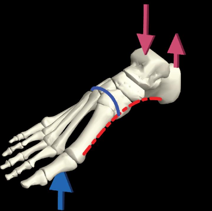 image: Schematic of the foot skeleton showing the arches and typical loading pattern during locomotion.