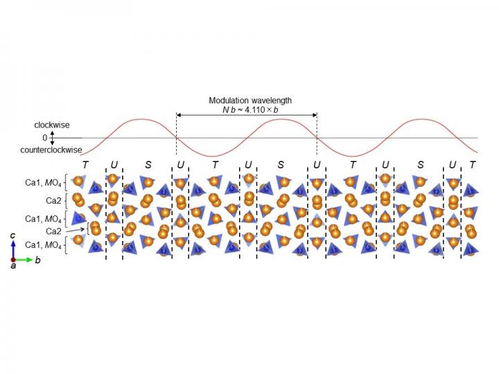 image: Has a non-integer multiple period of 4.11 times in the b-direction, and has a periodic structure in which T, S, and U repeat due to the difference in the MO4 gradient.