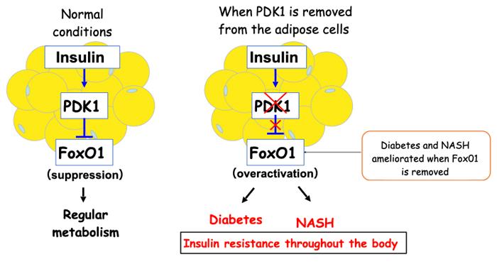 The current study revealed that insufficient insulin action in adipocytes leads to metabolic defects affecting the entire body via the hyperactivation of the protein FoxO1, which in turn results in the development of diabetes and NASH. The pathway revealed by the current study could serve as a potential target for the development of new drugs for these conditions.