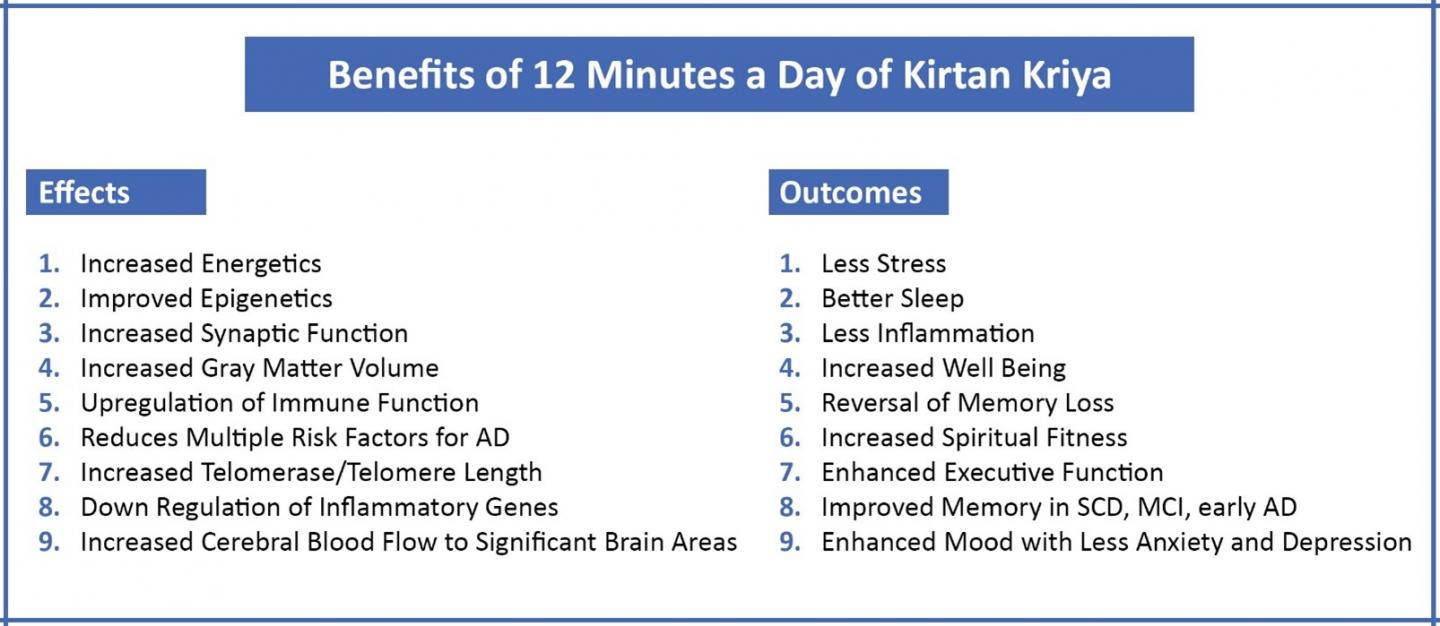 Stress and stress management are under-discussed topics in AD prevention, yet the authors point out that there is ample evidence that physical, psychological, and emotional effects of stress may elevate AD risk. Kirtan Kriya (KK) is a 12-minute singing meditation that involves four sounds, breathing, and repetitive finger movements. It has multiple documented effects on stress, such as improving sleep, decreasing depression, and increasing wellbeing. It has also been found to increase blood flow to areas of the brain involved in cognition and emotional regulation and increases grey matter volume and decreases ventricular size in long-term practitioners, which may slow brain aging. Research in healthy individuals, caregivers, and those with cognitive decline found that the practice improves cognition, slows memory loss, and improves mood.