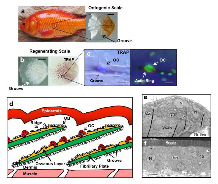 image: (a) A goldfish and a binocular view of an ontogenic scale. Grooves radiate from the center focus. (b) Binocular views of a regenerating scale on day 14 (left) and the same scale stained for TRAP activity, indicated by the red color along the grooves (right). The grooves formed a mesh-like structure at the center of the goldfish scales. (c) Light microscopic views of the surface on the osseous layer of the regenerating goldfish scales cultured for 86 h at 22°C on the ground. TRAP staining (left) and F-actin staining (right) superimposed with DAPI staining of the nuclei. A TRAP-positive multinucleated osteoclast possessed an actin ring along the groove. (d) Schematic illustration of morphological features of goldfish scales. Fish scales can regenerate following scale removal. On the groove edge of the goldfish scales, a multinucleated osteoclast exhibited a well-developed RB and CZs (e). Active cuboidal osteoblasts (f) are observed at the periphery and on the dermis side of the scale. They represent a highly-developed rER and Go. OB, osteoblast; OC, osteoclast; TRAP, tartrate-resistant acid phosphatase; DAPI, 4', 6-diamidino-2-phenylindole; N, nucleus; RB, ruffled border; CZ, clear zone; rER, rough endoplasmic reticulum; Go, Golgi apparatus. Scale bars = 1 mm in a and b, 10 μm in c, 5 μm in e and f.