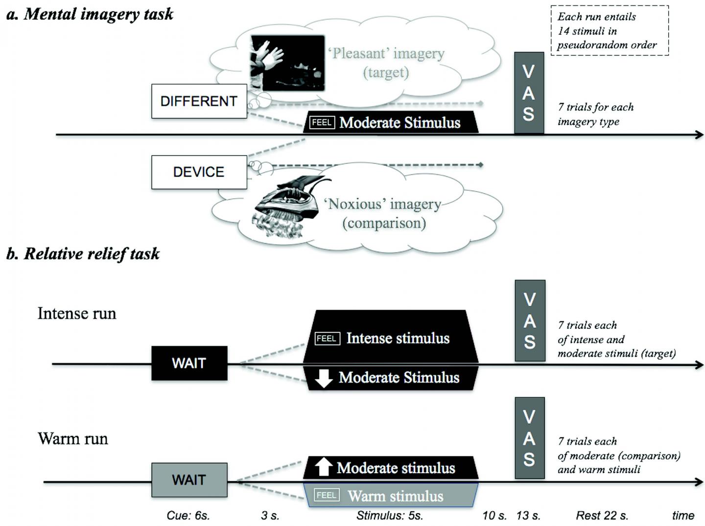 Chantal Berna, Siri Leknes and colleagues tested two approaches toward modulating pain perception. For a mental imagery task, healthy men and women were instructed to imagine individually calibrated heat pain applied to their forearm as a pleasant experience, for example by thinking about warming up by a fire after coming in from the cold. A relative relief task used visual cues to manipulate participants' expectations about the forthcoming heat pain. Although both tasks made the pain experience more pleasant, only the effects of the relative relief task were blocked by naloxone -- the life-saving drug used to treat opioid overdose. Mental imagery was unaffected by naloxone, indicating that this approach works through opioid-independent mechanisms.