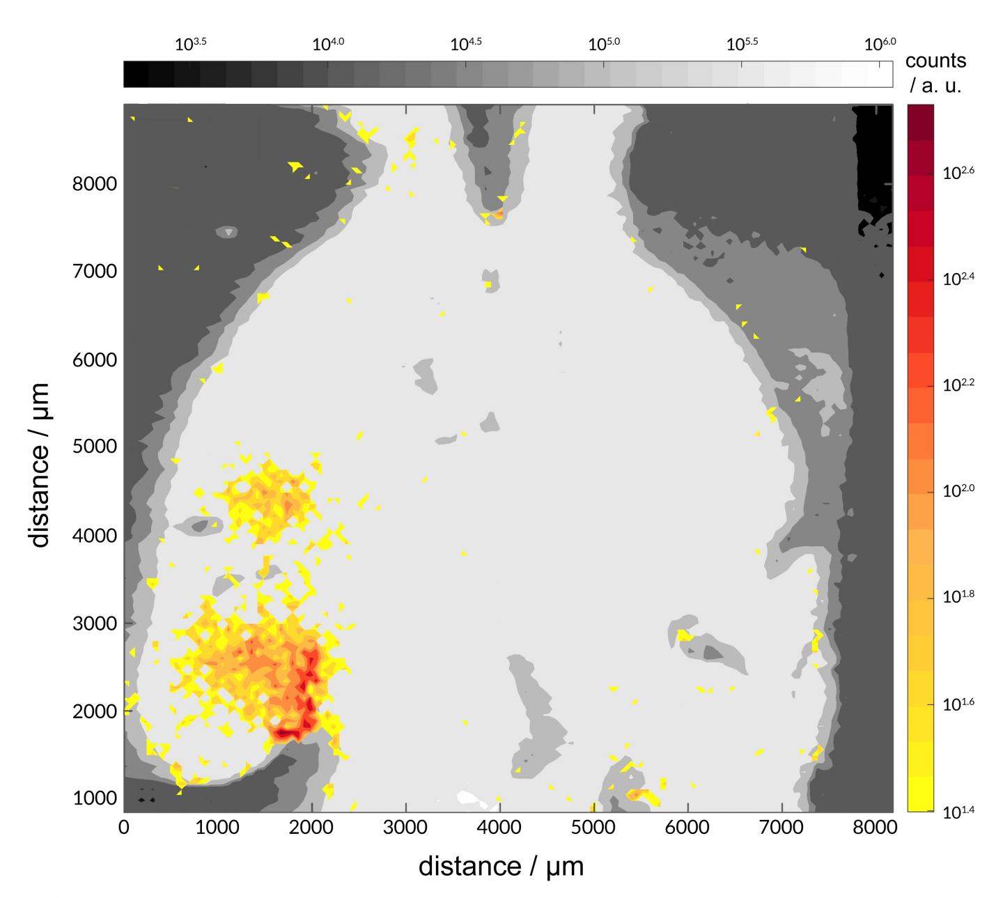 image: LA-ICP-MS (Laser Ablation Inductively Coupled Plasma Mass Spectrometry) image of the brain highlighting the area where one of the metal complexes under study accumulates. This area (left hippocampus) was sonicated; no evidence of metal complex accumulation can be seen in the right hippocampus (no-ultrasound control)
