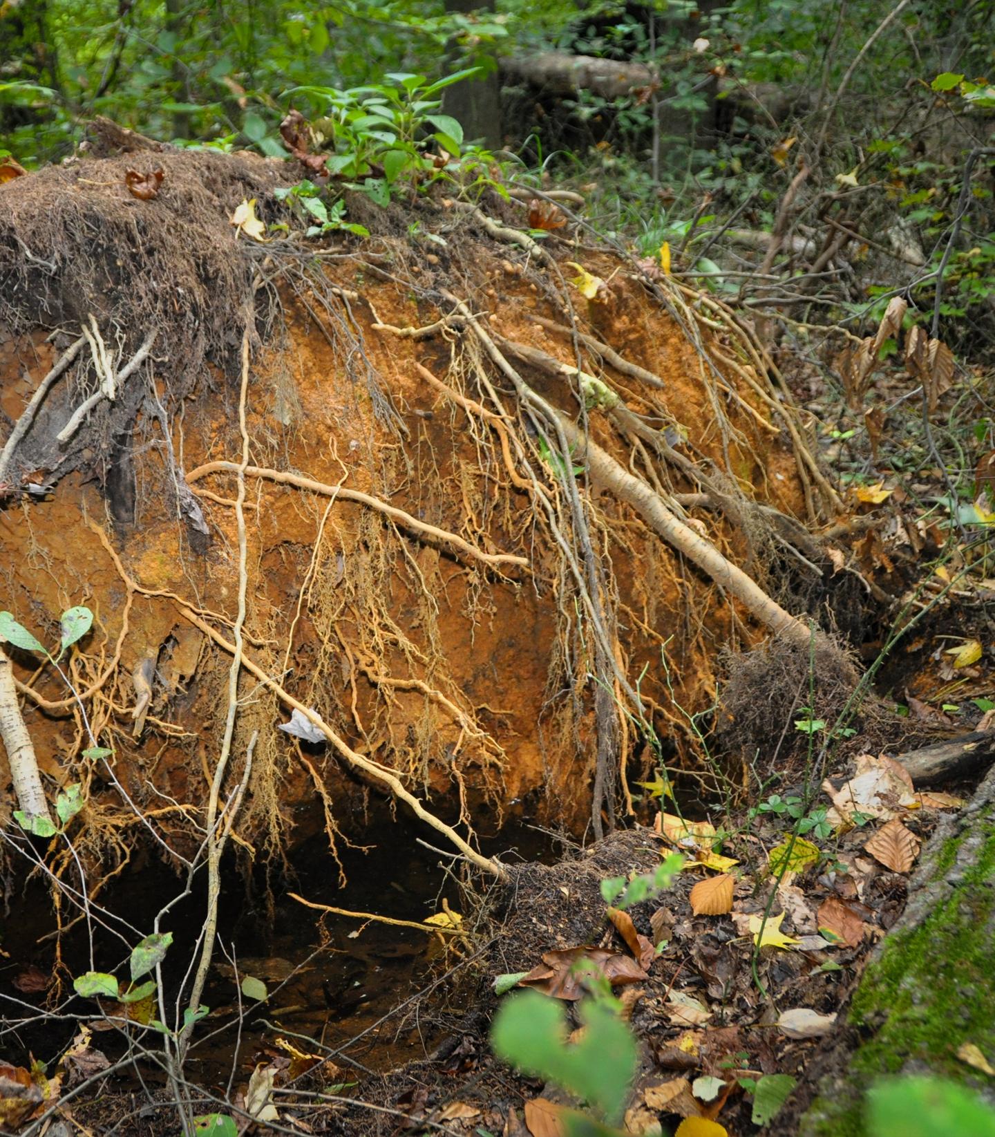 image: A fallen tree exposes iron-rich soils, the source of PFAS-degrading bacteria in a forested wetland at the Assunpink Wildlife Management Area in New Jersey.