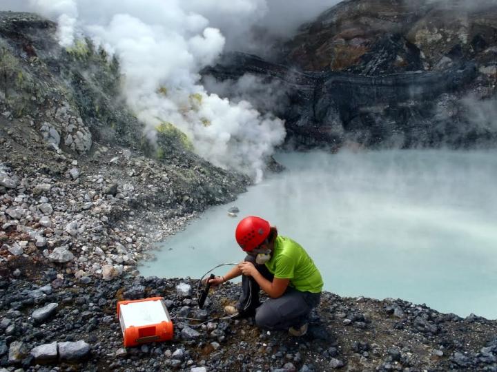 image: Sarah Black, who recently completed her Ph.D. in geological sciences at CU Boulder, analyzes minerals from recent eruptive activity near Laguna Caliente.