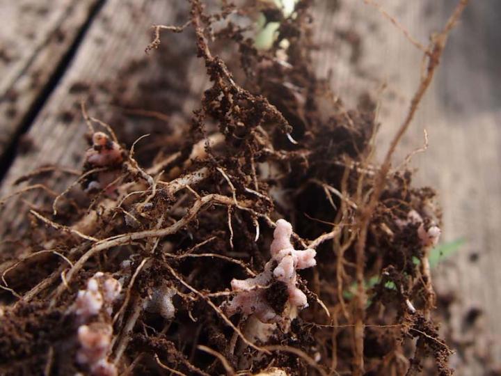 image: Nodules forming on the root of a soybean plant. These nodules will give a home to soil microbes in exchange for nitrogen.