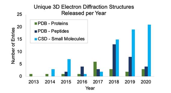 image: The growth of unique structure depositions by year in the Protein Data Bank (PDB) and Cambridge Structural Database (CSD) determined by MicroED or related 3D electron diffraction techniques. Depositions into the PDB are broken up into proteins and peptides. Proteins were defined as having more than 50 amino acids.