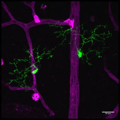 image: Retinal microglia (green), the resident immune cell of the central nervous system, and the retinal vasculature (magenta), in a retinal flat mount.