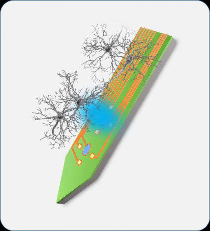 image: MicroLEDs optically control neurons and neural recording electrodes monitor neural activity.
