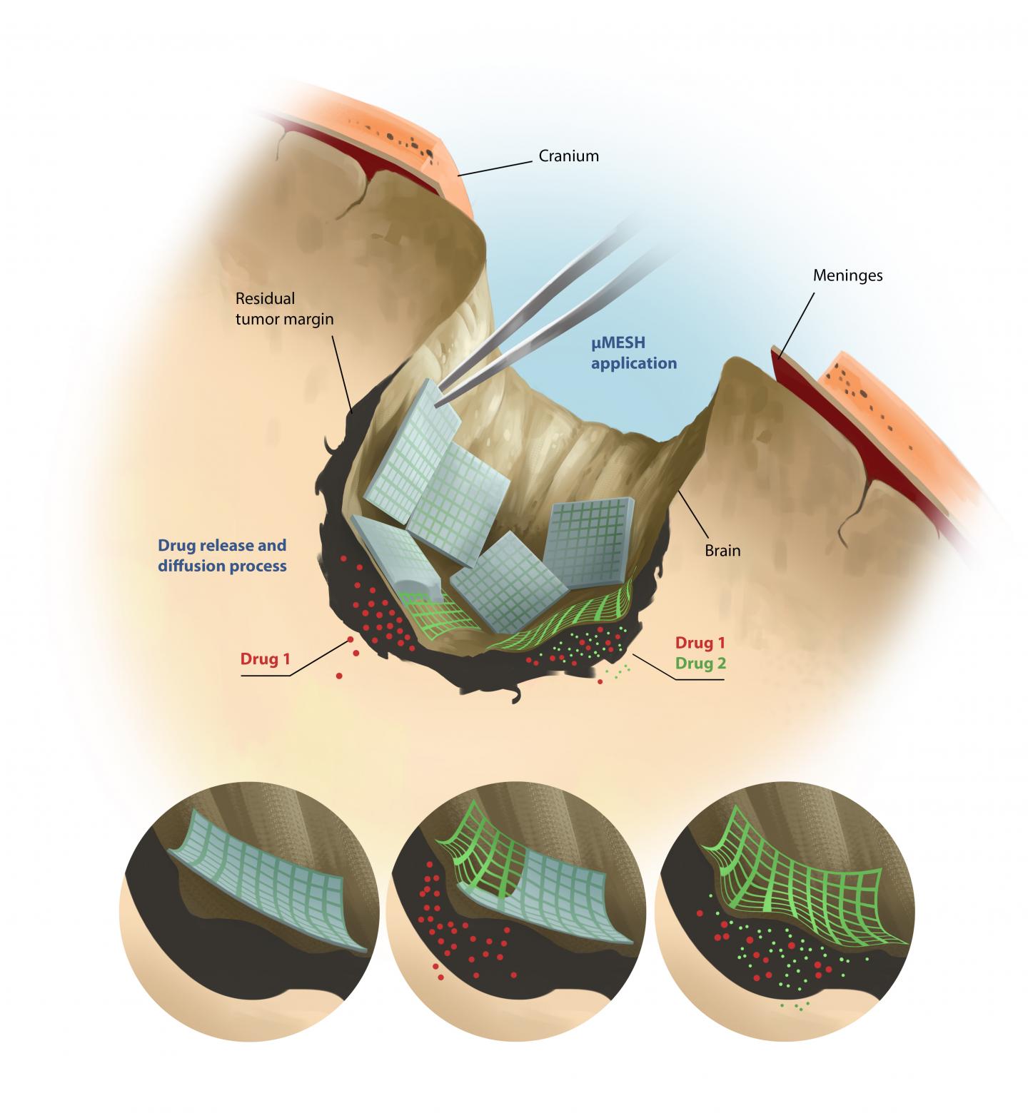 The microMESH has the shape of a micrometric polymeric net, it is made with biodegradable materials and wraps around the tumor mass. In fact, the micrometric thick polymeric fibers are very flexible and are arranged to form regular openings, which are also micrometric, just like the size of cancer cells. This unique feature allows the microMESH to achieve a closer interaction with the tumor mass, increasing the therapeutic efficacy. Its structure consists of two separate compartments in which different drugs can be loaded which are released towards the tumor mass in an independent, precise, and prolonged fashion. The microMESH can 'attack' glioblastoma by combining different therapies: chemotherapy, nanomedicine, and immunotherapy.